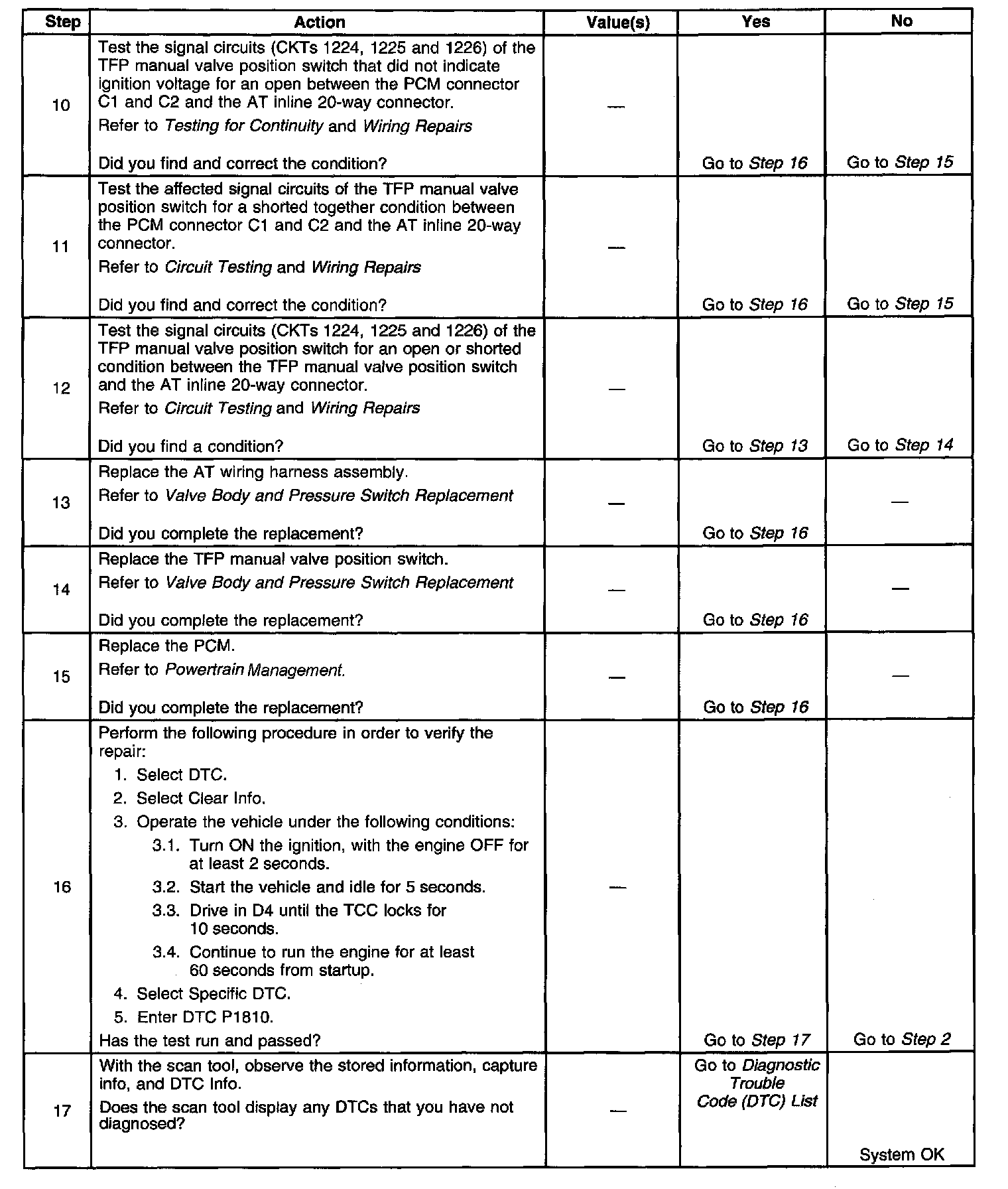 When the PCM detects an invalid state of the TFP manual valve position switch circuit by deciphering the TFP manual valve position switch inputs, then DTC P1810 sets. DTC P1810 is a type B DTC.