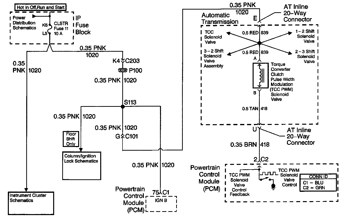 The torque converter clutch pulse width modulation (TCC PWM) solenoid valve controls the fluid acting on the converter clutch valve. The converter clutch valve controls the TCC application and release. The solenoid attaches to the control valve body within the transmission. The solenoid receives ignition voltage through the OFF/ON/START voltage circuit. The powertrain control module (PCM) controls the solenoid by providing a ground path on the TCC PWM solenoid valve control circuit. Current flows through the solenoid coil according to the duty cycle, percentage of ON and OFF time. The TCC PWM solenoid valve provides a smooth engagement of the TCC by operating during a duty cycle percent of ON time.