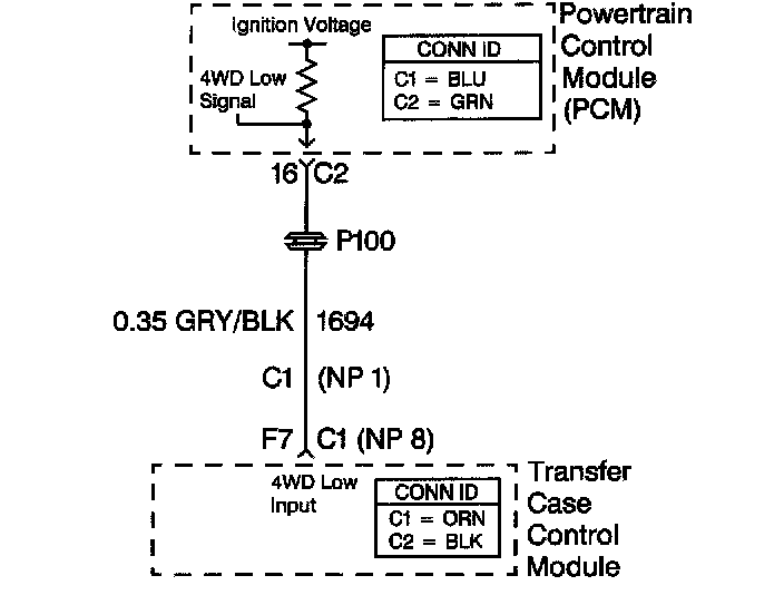 The four wheel drive (4WD) low circuit consists of the powertrain control module (PCM), a transfer case control module (TCCM) and the circuit wiring. The TCCM controls the 4WD low signal on the signal circuit. When the operator selects 4WD low, the TCCM grounds the signal circuit and the 4WD low signal voltage on the circuit changes from ignition voltage to zero volts. The PCM then compensates for transfer case gear reduction in the transmission output shaft speed (OSS) signal. The PCM uses the transmission OSS signal to adjust shift points, line pressure and torque converter clutch (TCC) scheduling.