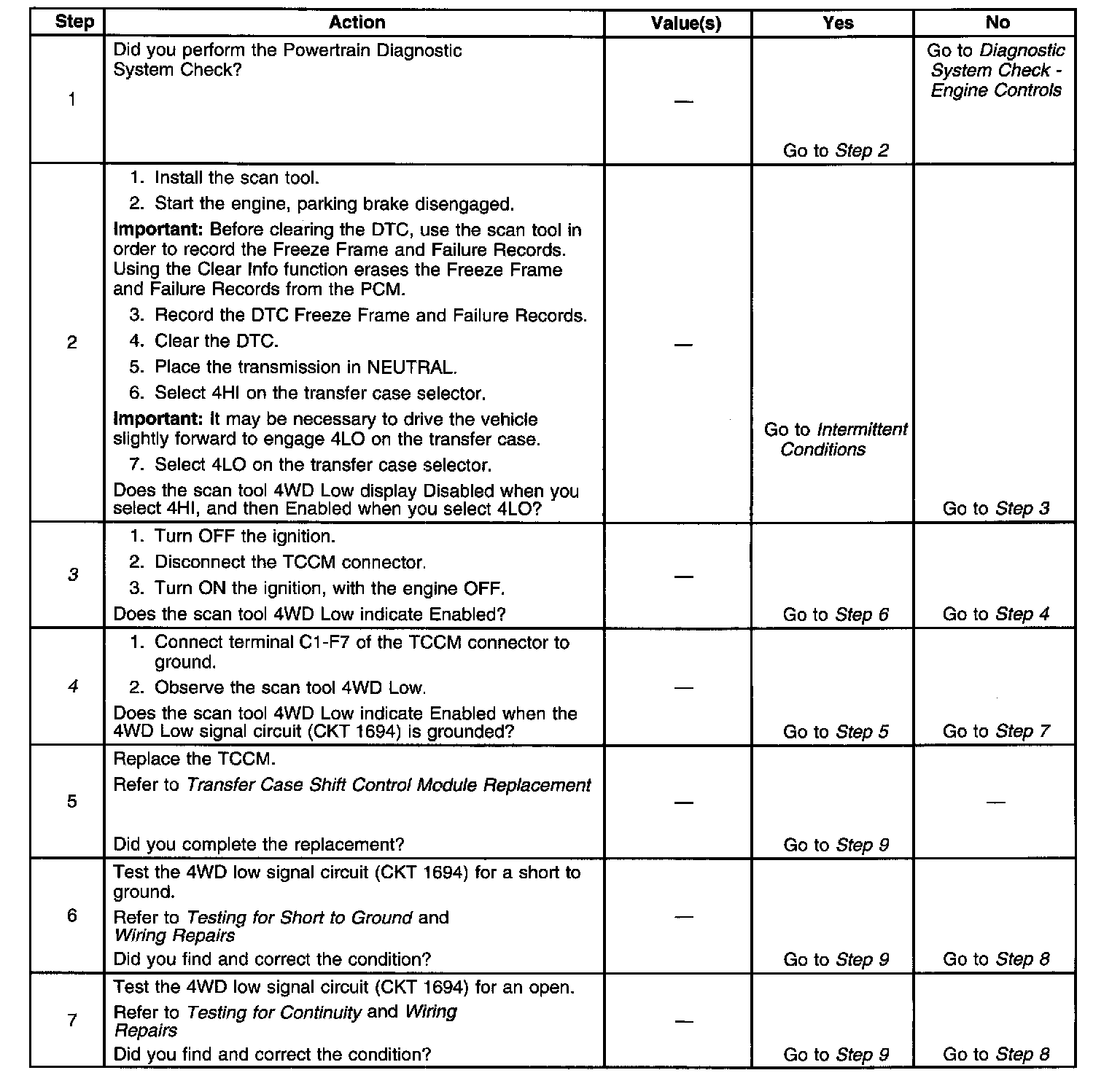 4. This step tests for an open in the 4WD low signal circuit (CKT 1694) or a faulty TCCM.
