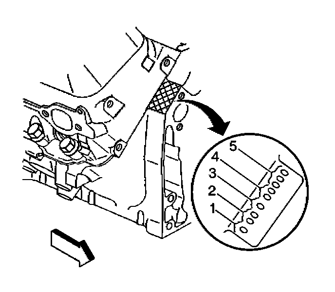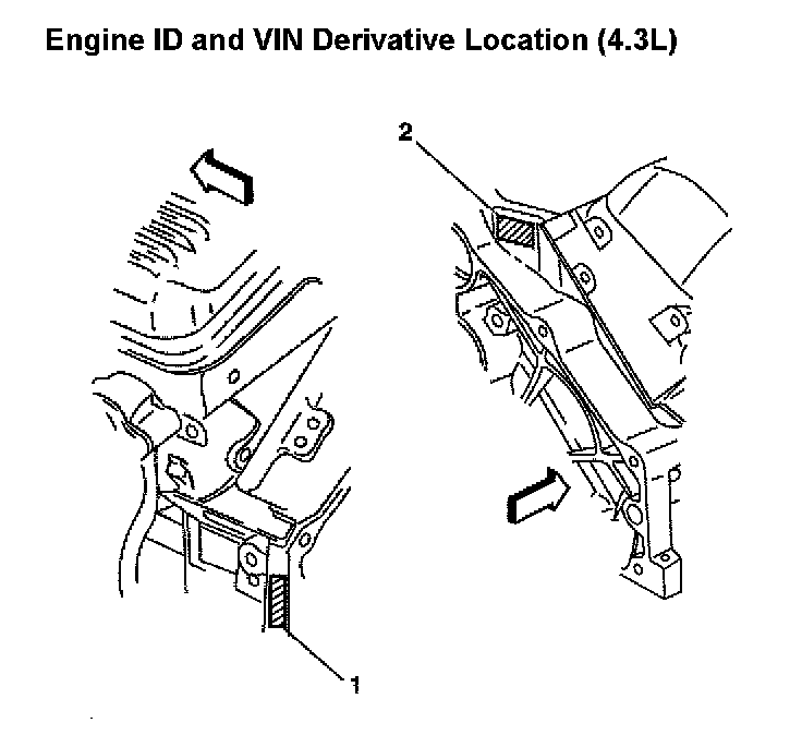 The Vehicle Identification Number (VIN) Derivative is located on the left side rear of the engine block (1) or on the right side rear (2) and typically is a nine digit number stamped or laser etched onto the engine at the vehicle assembly plant.