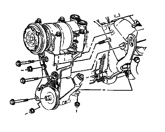 18. Slide the power steering pump mounting bracket with the power steering pump and the A/C compressor on the stud.