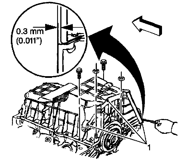 7. Measure the pan-to-transmission housing clearance using a feeler gage and a straight edge. Use a feeler gage to check the clearance between the oil pan-to-transmission housing measurement points. If the clearance exceeds 0.3 mm (0.011 inch) at any of the 3 oil pan-to-transmission housing measurement points (1), then repeat the step until the oil pan-to-transmission housing clearance is within the specification. The oil pan must always be forward of the rear face of the engine block.