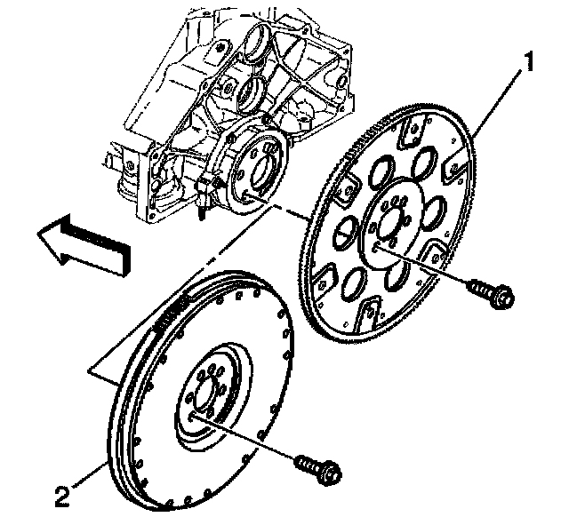 2. Install the engine flywheel (1 or 2) to the crankshaft. Align the engine flywheel locator hole to the flywheel locator pin.