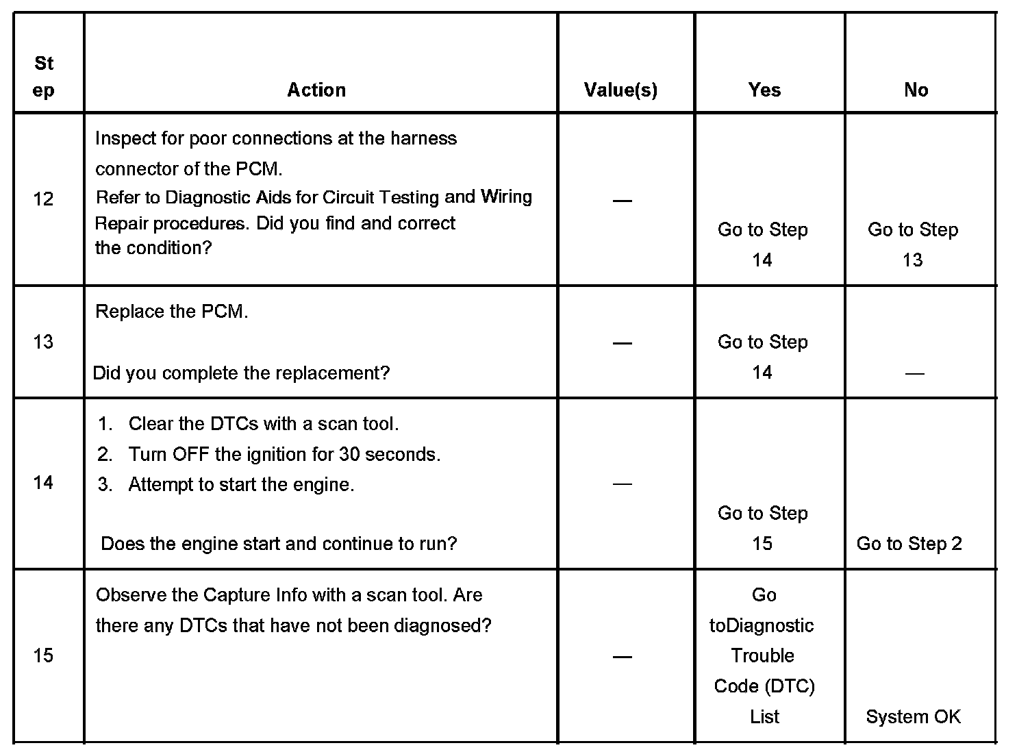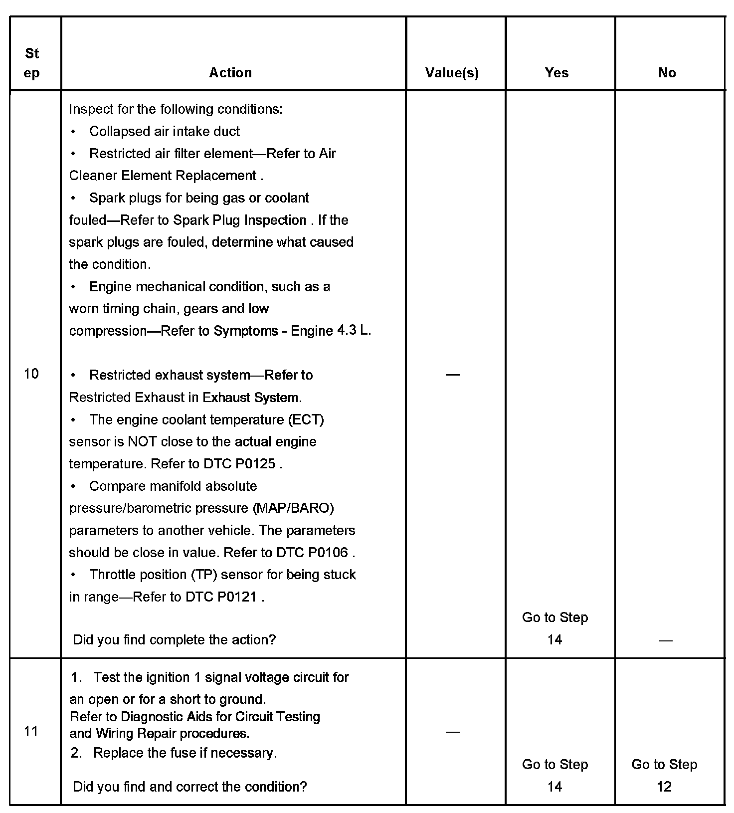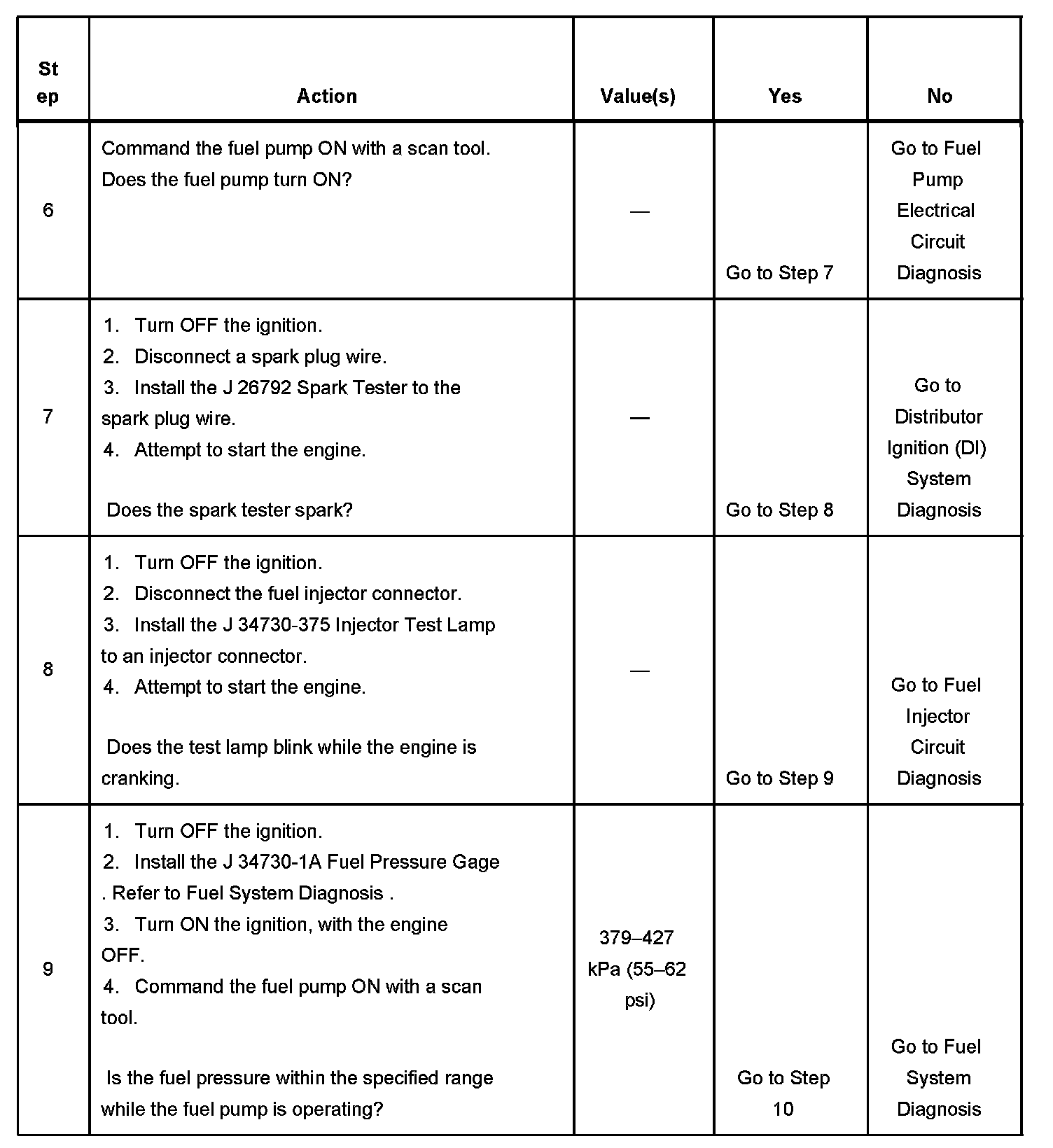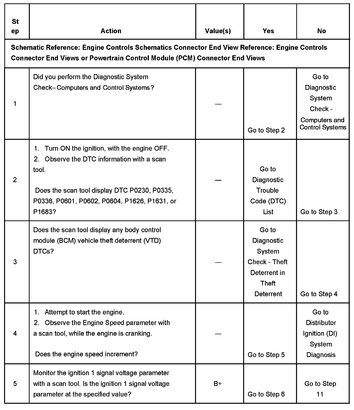 DESCRIPTIONThe Engine Cranks but Does Not Run diagnostic table is an organized approach to identifying a condition that prevents an engine from starting. The Engine Cranks but Does Not Run diagnostic table directs the service technician to the appropriate system diagnosis.