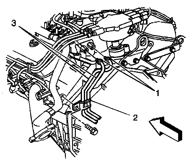 2. Disconnect the chassis evaporative emission (EVAP), fuel feed, and return pipes (1) at the engine compartment EVAP, fuel feed, and return pipes.