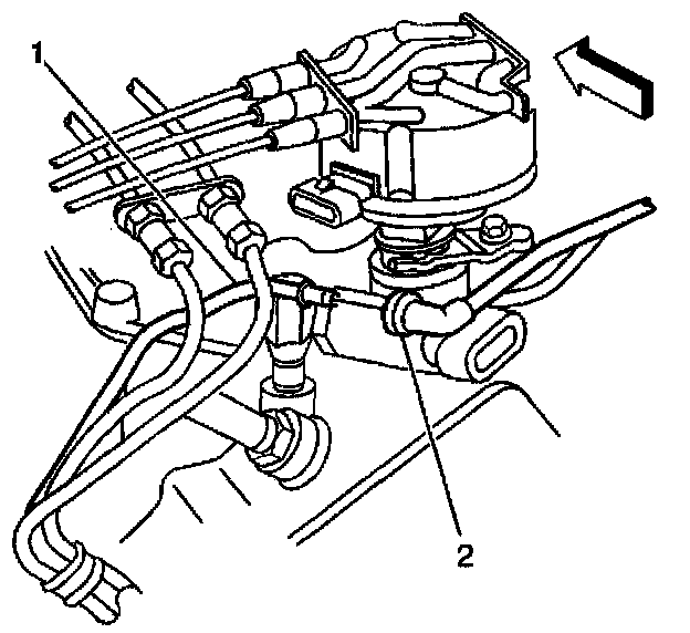 2. Disconnect the EVAP (2) pipe from the EVAP front chassis pipe (1).
