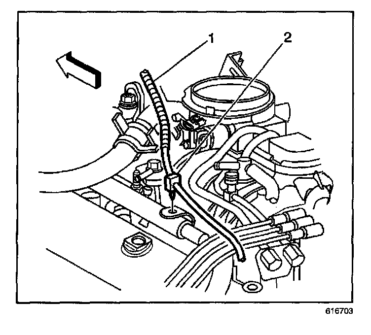 5. Disconnect the accelerator cable (1) from the bracket clip (2).