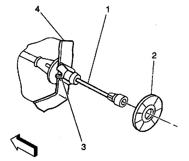 9. Squeeze the accelerator cable tangs (3) and push the cable through the bulkhead (4).