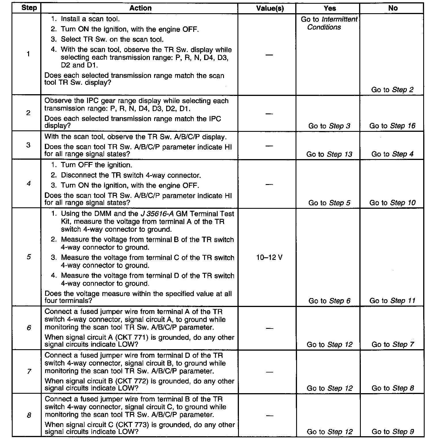 5. This step tests the TR switch wiring for an open or the lack of the signal voltage from the PCM.
