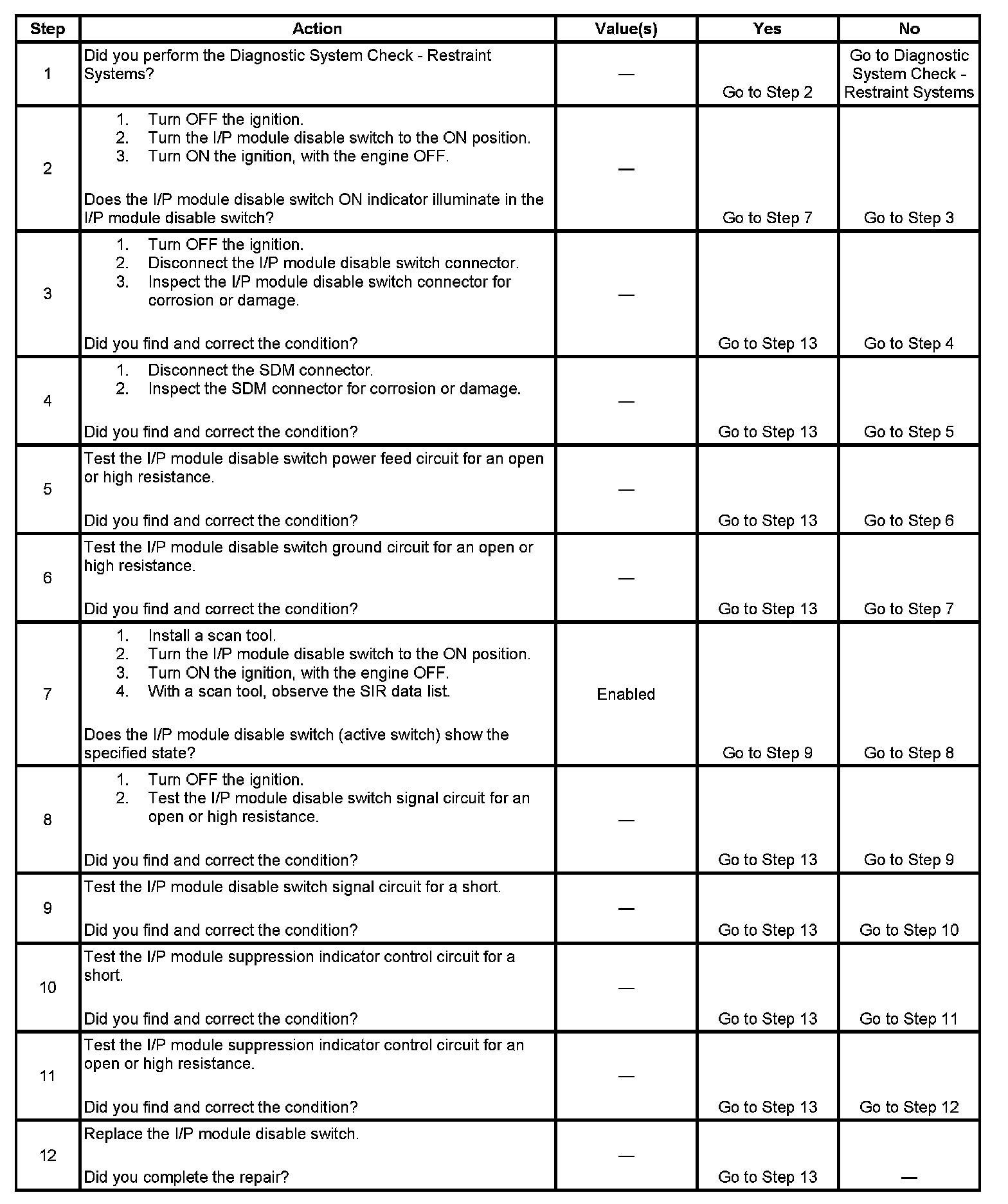The inflatable restraint I/P module disable switch circuit consists of an I/P module disable switch, I/P module disable switch indicator, I/P module disable switch signal circuit, and I/P module suppression indicator control circuit. When the ignition is turned ON, the inflatable restraint sensing and diagnostic module (SDM) performs tests to diagnose critical malfunctions within itself. The SDM monitors the voltage levels at the I/P module disable switch signal and the I/P module suppression indicator control circuits of the SDM to determine the position of the I/P module disable switch. If a malfunction is detected, a DTC will be stored.