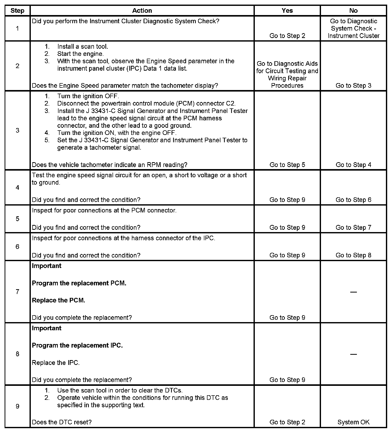 The instrument panel cluster (IPC) monitors the engine speed signal to determine the tachometer position. If the IPC determines the engine speed signal voltage is out of the normal operating range, a DTC will set.