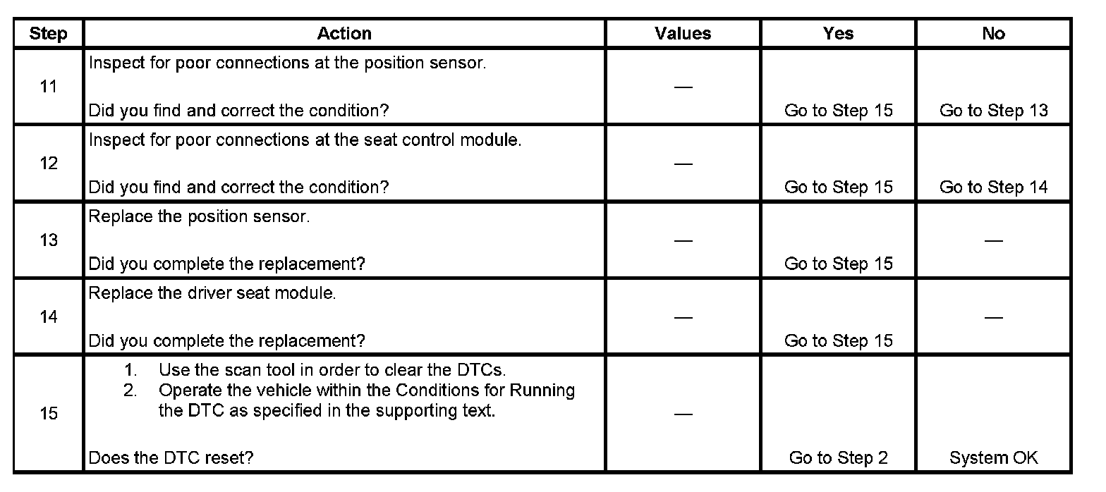 The position sensor signal circuit voltage level to the driver seat module is not within the 0.39-4.58 volt range.
