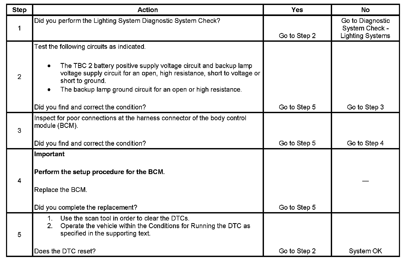 - When the BCM is not receiving a backup lamp request signal and the backup lamp supply voltage circuit is open or shorted to voltage.