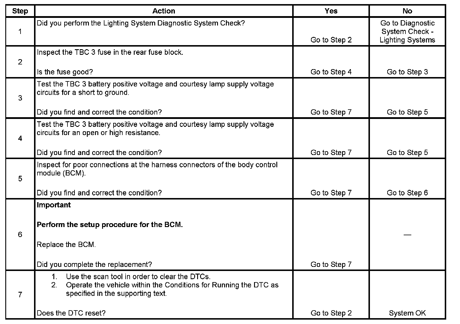 4. This step test determines if an open exists in the TBC 3 battery positive voltage circuit, the courtesy lamp supply voltage circuit, or internally within the BCM.