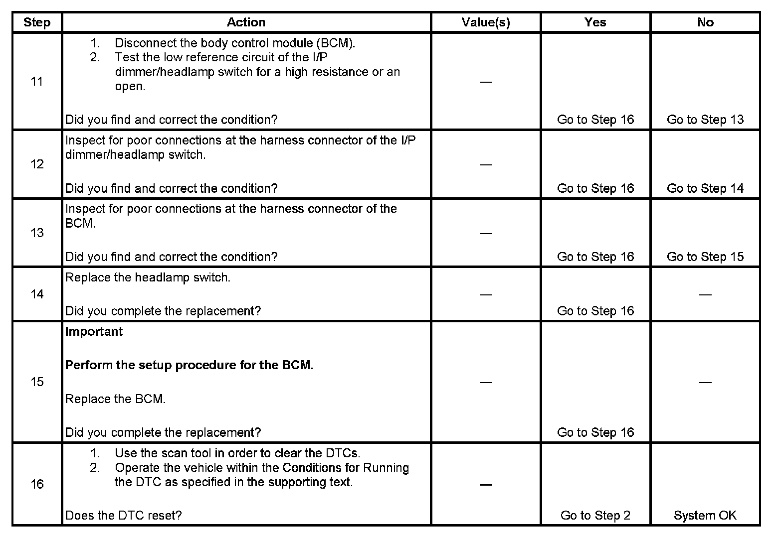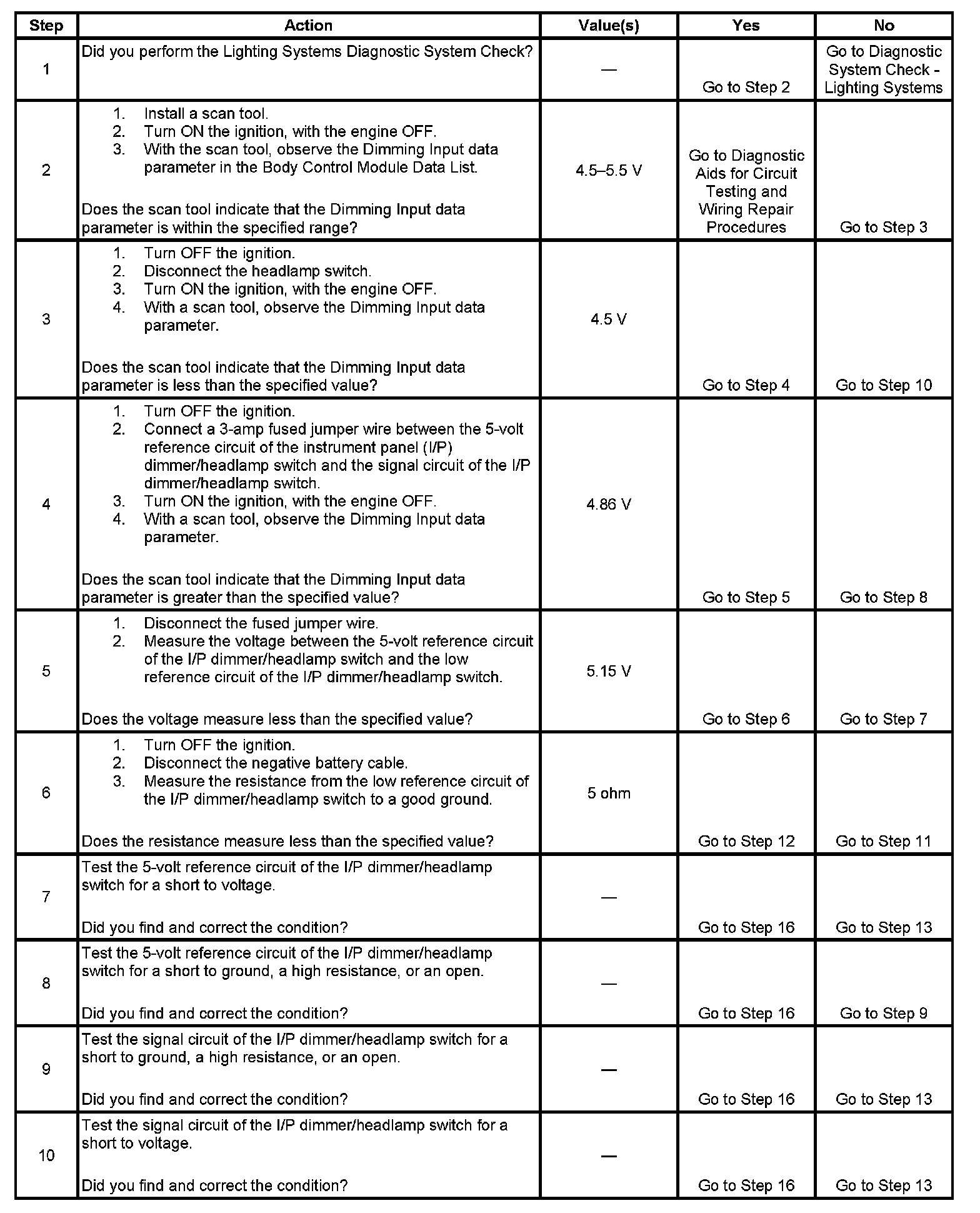 The body control module (BCM) directly sends a 5-volt reference voltage to the instrument panel (I/P) dimmer switch which is then adjusted based on the I/P dimmer switch position and returned as a low reference and a signal to the BCM. The BCM uses this signal to directly control the desired level of instrument panel illumination lamp intensity.