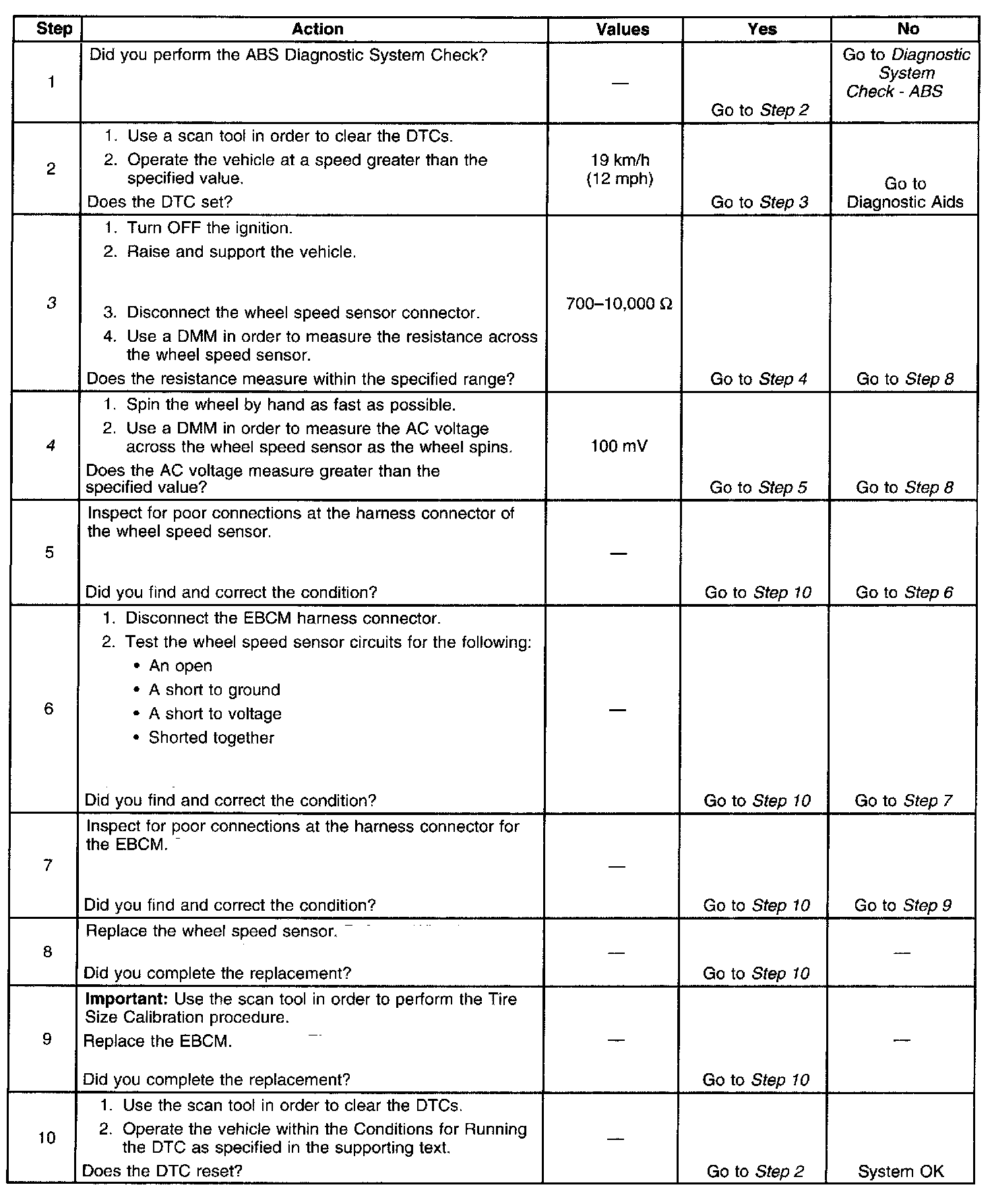 ^ After the DTC is cleared and the ignition is ON, the ABS indicator may remain ON until the EBCM completes a power-up self-test. This test concludes when the vehicle reaches a speed greater than 13 km/h (8 mph) and the wheel speeds are verified by the EBCM.