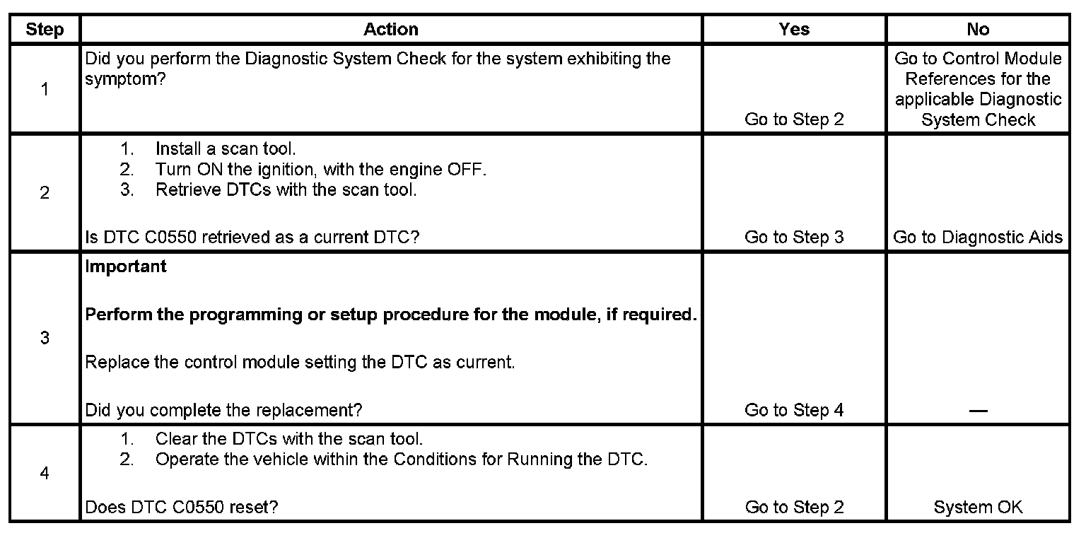 - If DTC C0550 is retrieved as both a current and history DTC, replace the module that set the DTC.