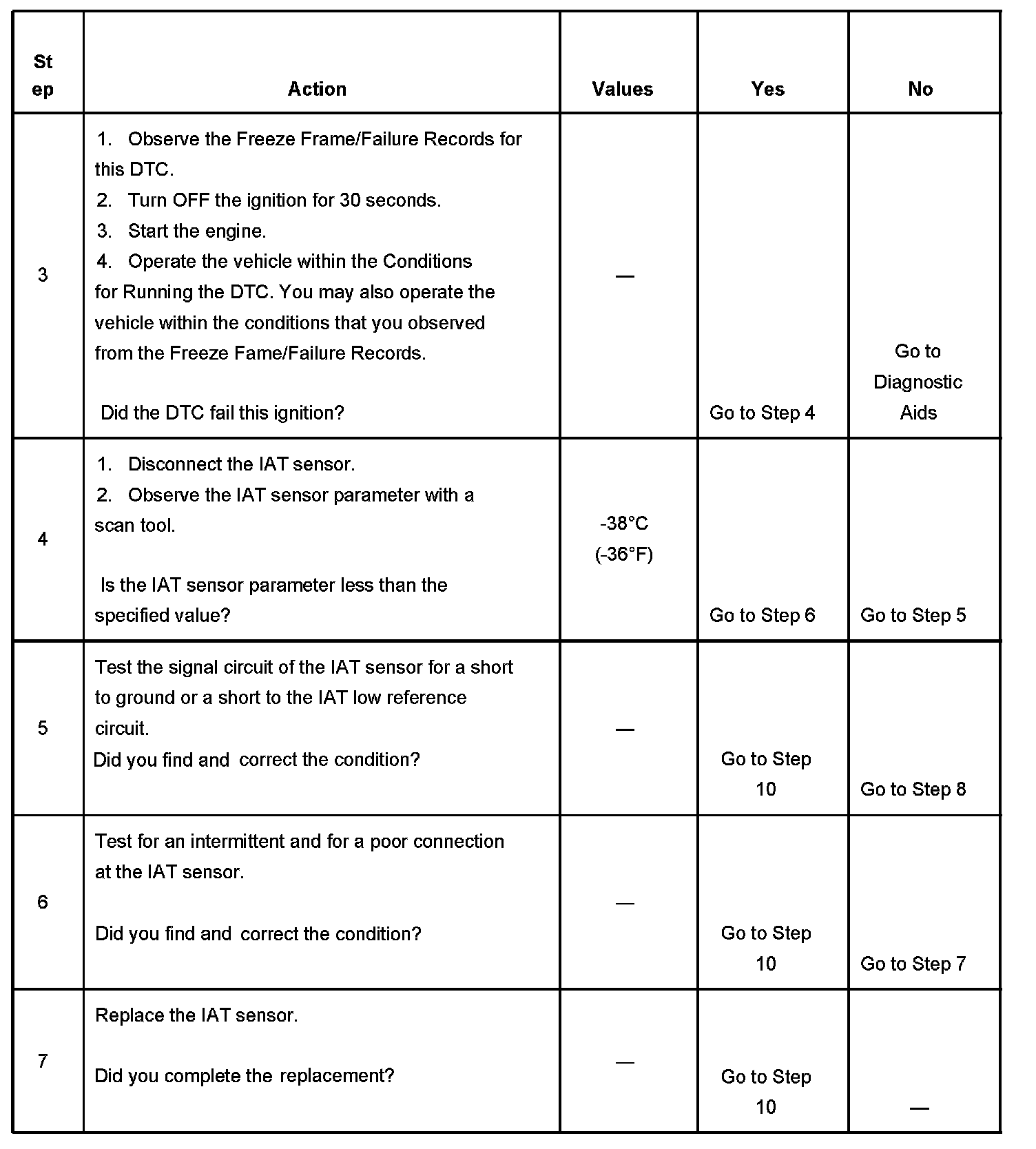 The intake air temperature (IAT) sensor is a variable resistor. The IAT sensor has a signal circuit and a low reference circuit. The IAT sensor measures the temperature of the air entering the engine. The powertrain control module (PCM) supplies 5 volts to the IAT signal circuit and a ground for the IAT low reference circuit. When the IAT sensor is cold, the sensor resistance is high. When the air temperature increases, the sensor resistance decreases. With high sensor resistance, the PCM detects a high voltage on the IAT signal circuit. With lower sensor resistance, the PCM detects a lower voltage on the IAT signal circuit. If the PCM detects an excessively low IAT signal voltage, indicating a high temperature, DTC P0112 sets.