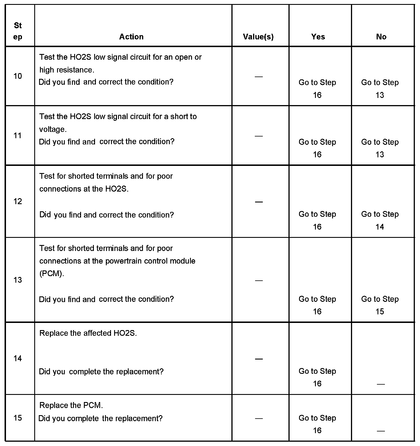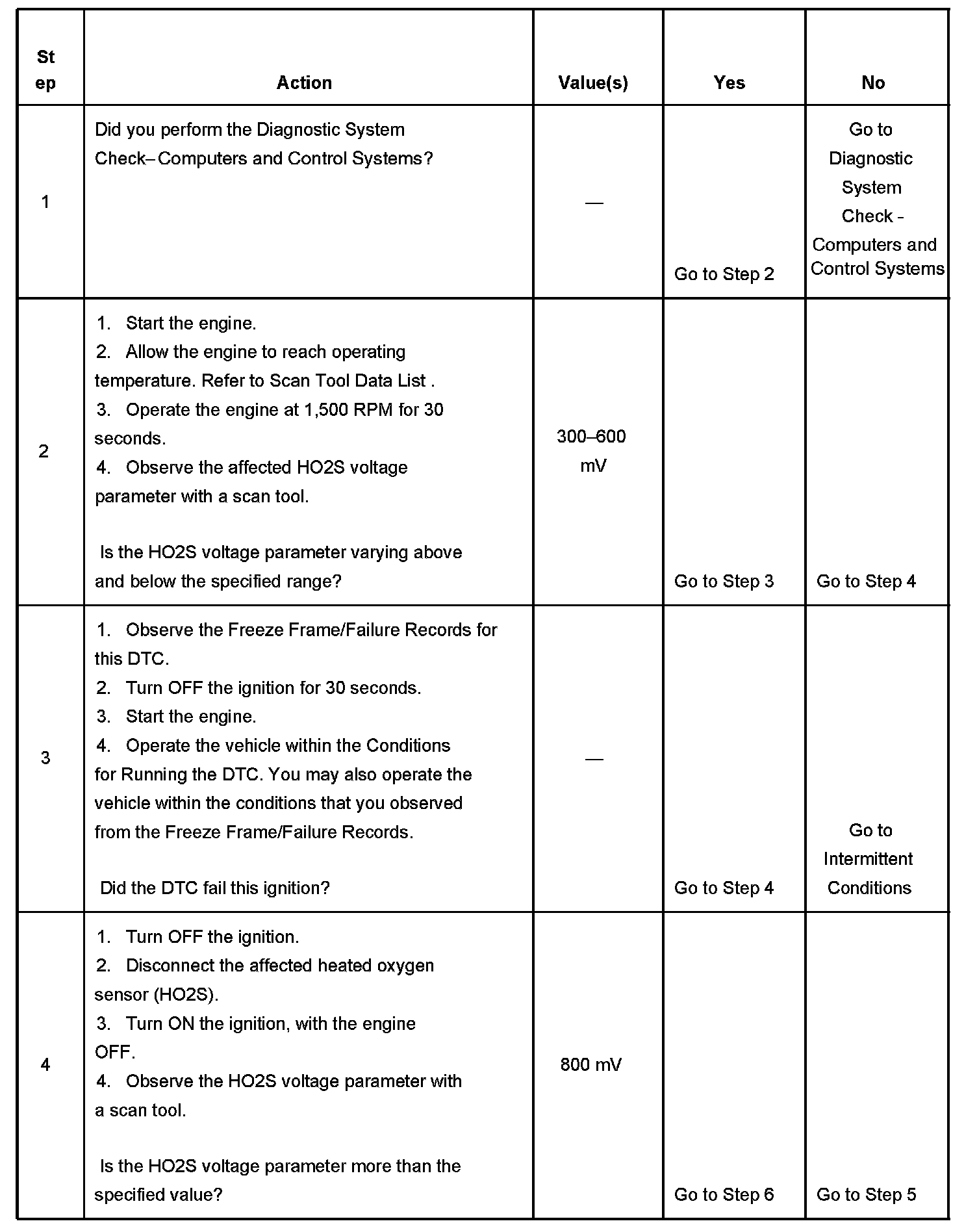 Heated oxygen sensors (HO2S) are used for fuel control and post catalyst monitoring. Each HO2S compares the oxygen content of the surrounding air with the oxygen content in the exhaust stream. The HO2S must reach operating temperature to provide an accurate voltage signal. Heating elements inside the HO2S minimize the time required for the sensors to reach operating temperature. The powertrain control module (PCM) supplies the HO2S with a reference, or bias, voltage of about 450 mV. When the engine is first started the PCM operates in open loop, ignoring the HO2S voltage signal. Once the HO2S reaches operating temperature and closed loop is achieved, the HO2S generates a voltage within a range of 0-1,000 mV that fluctuates above and below bias voltage. High HO2S voltage indicates a rich exhaust stream; low HO2S voltage indicates a lean exhaust stream. If the PCM detects that the HO2S voltage remains within the bias voltage range, DTC P0134 sets for HO2S bank 1 sensor 1, or P0154 sets for HO2S bank 2 sensor 1.