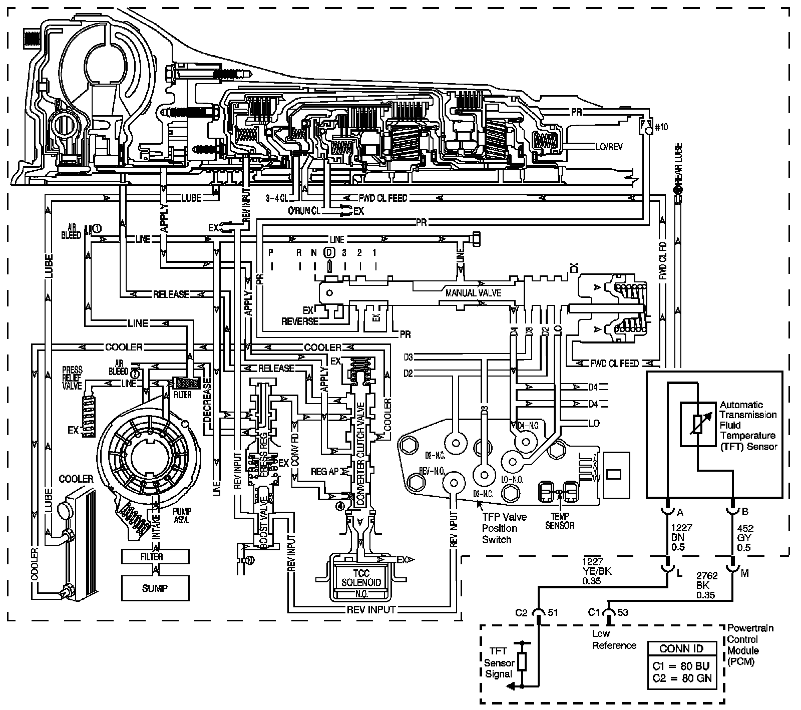 The flow of transmission fluid starts in the bottom pan and is drawn through the filter, control valve body assembly, transmission case and into the oil pump assembly. The oil pump assembly pressurizes the fluid and directs it to the pressure regulator valve where it becomes the main supply of fluid to the various components and hydraulic circuits in the transmission. Hot fluid exiting the torque converter flows through the converter clutch apply valve and into the transmission cooler lines to the oil cooler located in the vehicle radiator, and auxiliary cooler if equipped. From the cooler, fluid returns to cool and lubricate the front of the transmission. In forward drive ranges, D4 fluid from the manual valve is routed through an orificed cup plug in the rear of the transmission case to feed the rear lube fluid circuit.