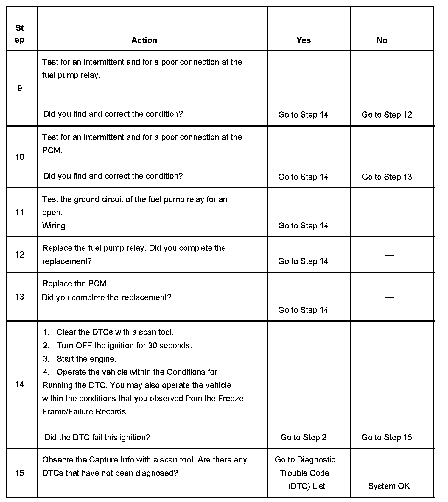 The numbers below refer to the step numbers on the diagnostic table.