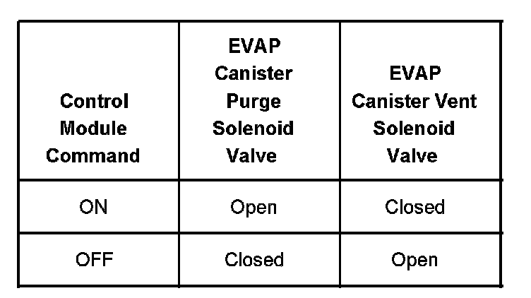 The table illustrates the relationship between the ON and OFF states, and the Open or Closed states of the EVAP canister purge and vent solenoid valves.
