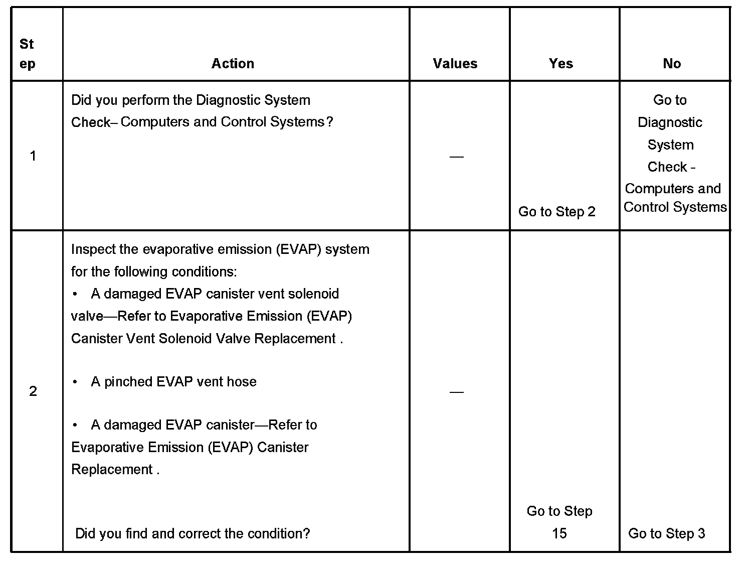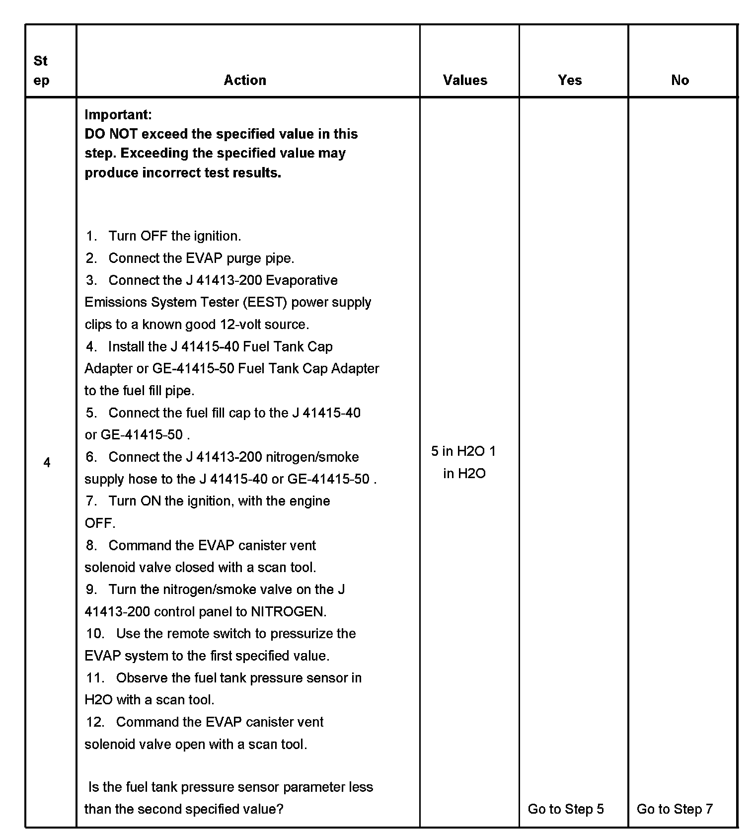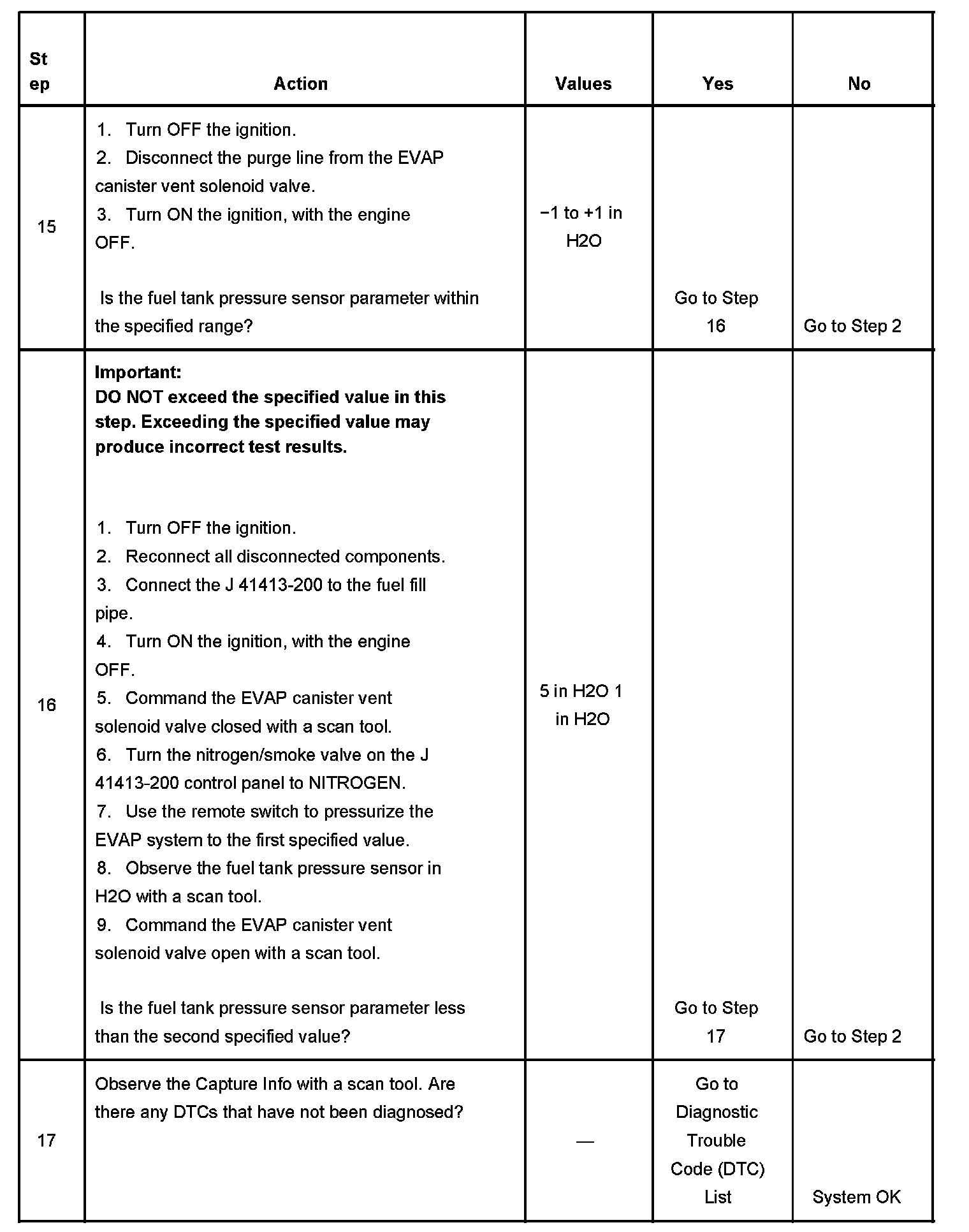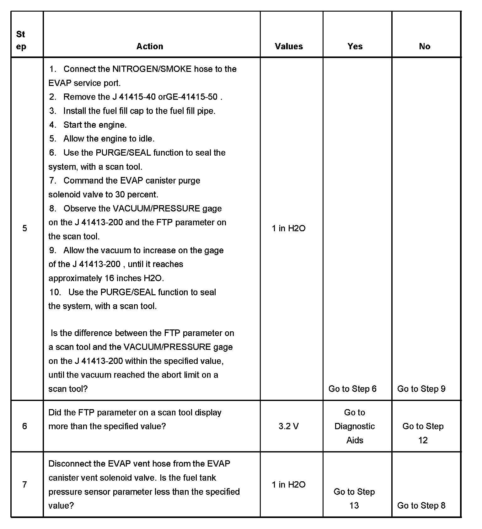 This DTC tests the evaporative emission (EVAP) system for a restricted or blocked EVAP vent path. The control module commands the EVAP canister purge solenoid Open and the EVAP canister vent solenoid Closed. This allows vacuum to be applied to the EVAP system. Once a calibrated vacuum level has been reached, the control module commands the EVAP canister purge solenoid Closed and the EVAP canister vent solenoid Open. The control module monitors the fuel tank pressure (FTP) sensor for a decrease in vacuum. If the vacuum does not decrease to near 0 inches H2O in a calibrated time, this DTC sets.
