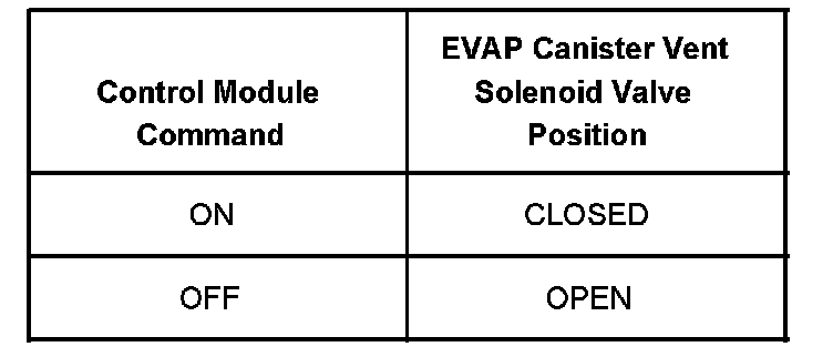 The table illustrates the relationship between the ON and OFF states, and the OPEN or CLOSED states of the EVAP canister vent solenoid valve.