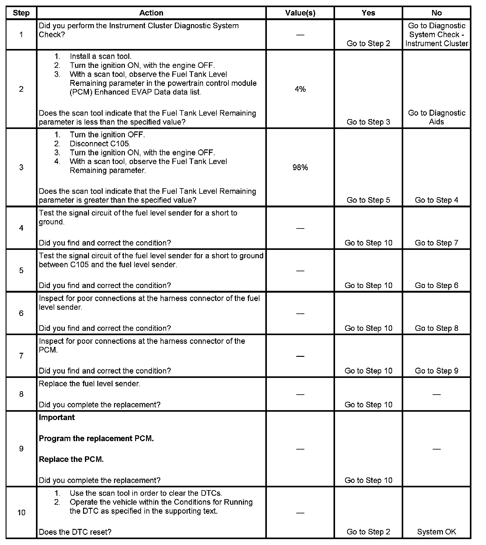 The fuel level sender changes resistance based on fuel level. The powertrain control module (PCM) monitors the signal circuit of the fuel level sender in order to determine fuel level. When the fuel tank is full, the sender resistance is high and the PCM senses a high signal voltage. When the fuel tank is empty, the sender resistance is low and the PCM senses a low signal voltage. The PCM uses the signal circuit of the fuel level sender in order to calculate the total remaining fuel, percent, in the tank. The PCM sends the fuel level percent via the class 2 serial data circuit to the instrument cluster in order to control the fuel gage. The fuel level information is also used for misfire and evaporative emission (EVAP) diagnostics.