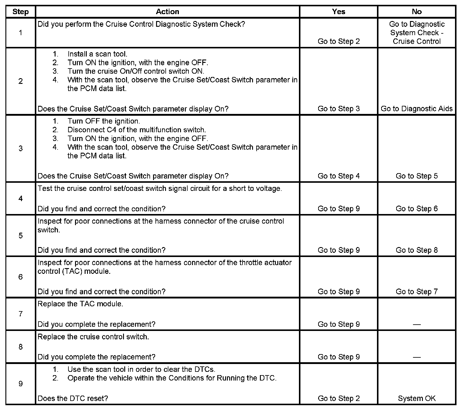 The cruise control set/coast switch is an input to the throttle actuator control (TAC) module. The TAC module uses the cruise control set/coast switch signal circuit in order to detect when the driver has requested to set the vehicle speed or to decelerate the vehicle speed. The TAC module detects a voltage signal on the cruise control set/coast switch signal circuit when the switch is applied. The TAC module sends a serial data signal to the powertrain control module (PCM) via the universal asynchronous receiver transmitter (UART) serial data circuit. This DTC sets if the PCM receives a serial data signal from the TAC module indicating that voltage is present on the cruise control set/coast switch signal circuit for longer than 90 seconds.
