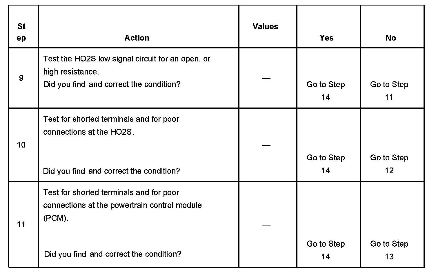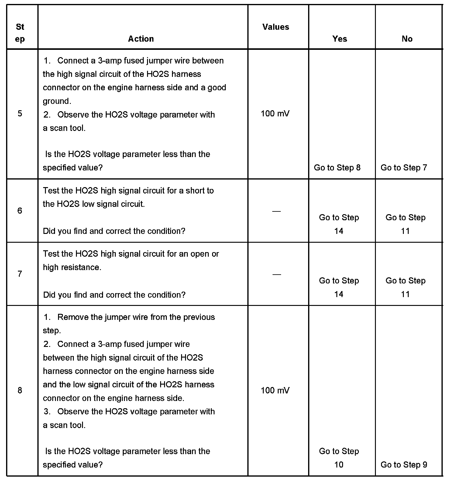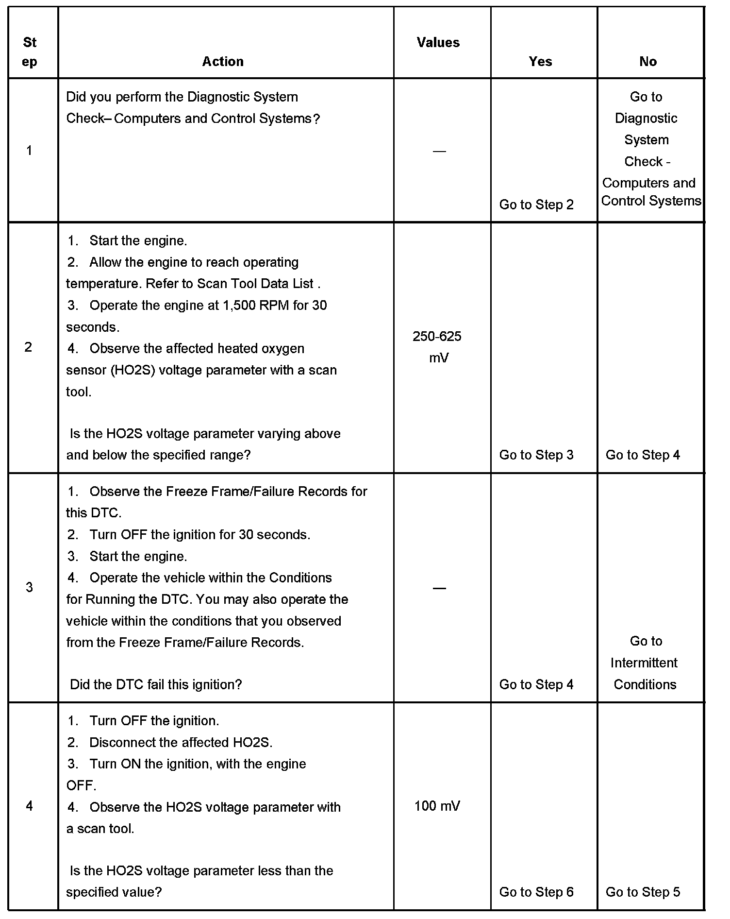 Heated oxygen sensors (HO2S) are used for fuel control and post catalyst monitoring. Each HO2S compares the oxygen content of the surrounding air with the oxygen content in the exhaust stream. The HO2S must reach operating temperature to provide an accurate voltage signal. Heating elements inside the HO2S minimize the time required for the sensors to reach operating temperature. The powertrain control module (PCM) supplies the HO2S with a reference, or bias, voltage of about 450 mV. When the engine is first started the PCM operates in open loop, ignoring the HO2S voltage signal. Once the HO2S reaches operating temperature and closed loop is achieved, the HO2S generates a voltage within a range of 0-1,000 mV that fluctuates above and below bias voltage. High HO2S voltage indicates a rich exhaust stream; low HO2S voltage indicates a lean exhaust stream. This diagnostic will only run once per ignition cycle. The PCM monitors the number of rich-to-lean and lean-to-rich transitions. If the PCM detects that the number of transitions were less than a specified value, DTC P1133 sets for HO2S bank 1 sensor 1, or DTC P1153 sets for HO2S bank 2 sensor 1.