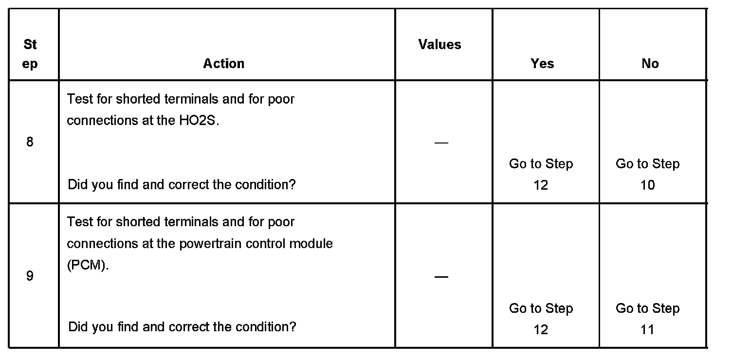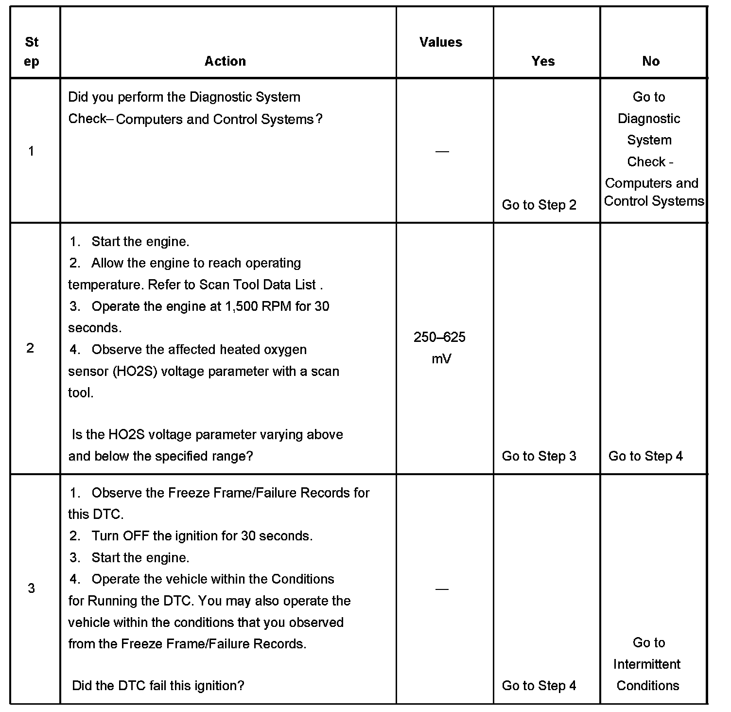 Heated oxygen sensors (HO2S) are used for fuel control and post catalyst monitoring. Each HO2S compares the oxygen content of the surrounding air with the oxygen content in the exhaust stream. The HO2S must reach operating temperature to provide an accurate voltage signal. Heating elements inside the HO2S minimize the time required for the sensors to reach operating temperature. The powertrain control module (PCM) supplies the HO2S with a reference, or bias, voltage of about 450 mV. When the engine is first started the PCM operates in open loop, ignoring the HO2S voltage signal. Once the HO2S reaches operating temperature and closed loop is achieved, the HO2S generates a voltage within a range of 0-1,000 mV that fluctuates above and below bias voltage. High HO2S voltage indicates a rich exhaust stream; low HO2S voltage indicates a lean exhaust stream. This diagnostic will only run once per ignition cycle. The PCM monitors the rich-to-lean and lean-to-rich transition time. A transition is defined as, the HO2S voltage changes from above 625 mV to below 250 mV or from below 250 mV to above 625 mV. If the PCM detects that the difference between the rich-to-lean average transition time and lean-to-rich average transition time is more than a specified value, DTC P1134 sets for HO2S bank 1 sensor 1, or DTC P1154 sets for HO2S bank 2 sensor 1.