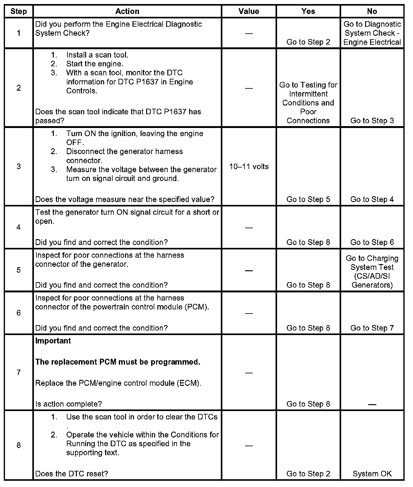 The powertrain control module (PCM) uses the generator turn on signal circuit to control the generator. A high side driver within the PCM allows the PCM to turn the generator ON and OFF. When generator operation is desired, the PCM sends a 10-11 volt signal to the voltage regulator via the generator turn on signal circuit. This causes the voltage regulator to begin controlling the generator field circuit. Once the generator is enabled by the PCM, the voltage regulator controls generator output independently of the PCM. Under certain operating conditions, the PCM can turn OFF the generator by turning OFF the 10-11 volt signal on the generator turn ON signal circuit. The PCM has fault detection circuitry which monitors the state of the generator turn ON signal circuit. If the fault detection circuit senses a voltage other than what is expected, this DTC will set. The voltage regulator also contains fault detection circuitry. If the regulator detects a problem, the regulator will ground the generator turn on signal circuit, pulling the voltage low. This also causes the PCM to set the DTC.