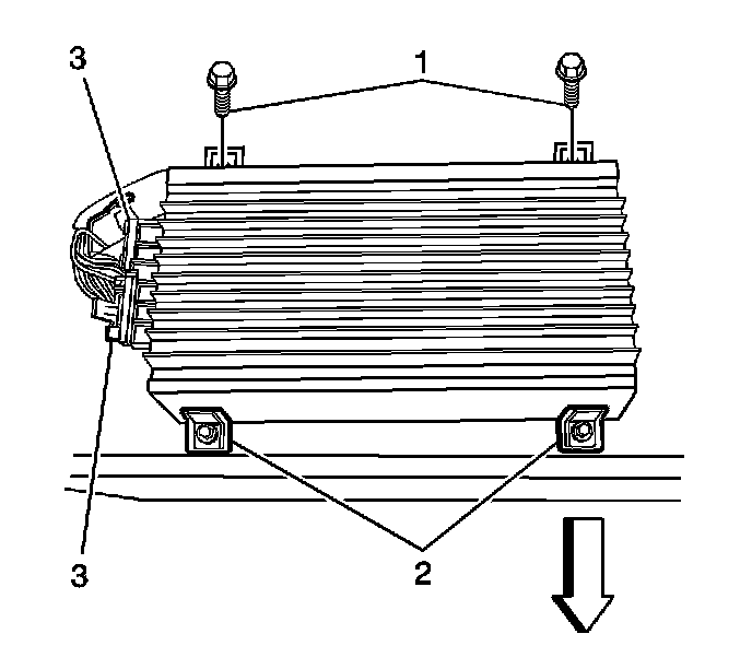 9. Remove the 4 fasteners (1, 2) retaining the amplifier to the body rear accessory compartment.