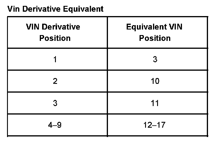 VIN DERIVATIVEAll engines and transmissions are stamped or laser etched with a partial Vehicle Identification Number (VIN), which was derived from the complete VIN. A VIN derivative contains the 9 positions as in the table.