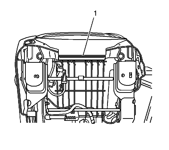 9. Install the push pins (1) that retain the seat cushion cover to the side of the seat cushion frame.