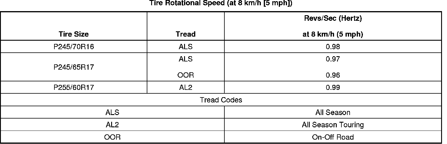1. Determine the rotational speed of the tires in revolutions per second (RPS), or Hertz (Hz), at 8 km/h (5 mph), based on the size of the tires. Refer to the preceding Tire Rotational Speed table.