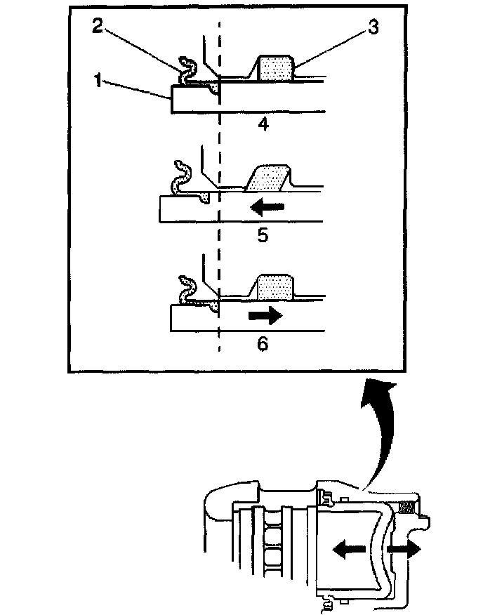 3. While the brake system is at rest (4), observe the position of the caliper piston (1) in relation to the caliper housing.