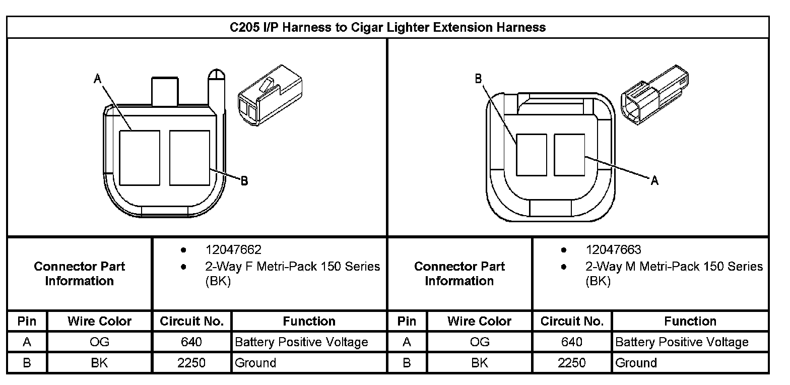C205 I/P Harness To Cigar Lighter Extension Harness Information: