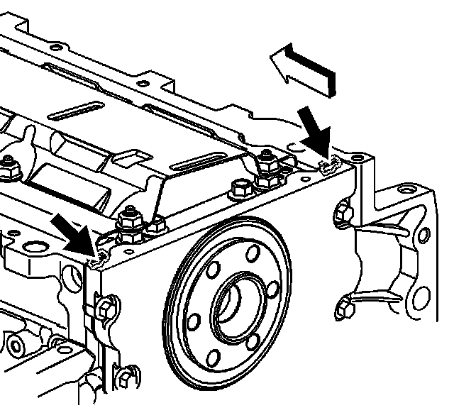 5. Apply a 5 mm (0.2 inch) bead of sealant GM P/N 12378190 or equivalent 20 mm (0.8 inch) long to the engine block. Apply the sealant directly onto the tabs of the front cover gasket that protrude into the oil pan surface. Refer to Sealers, Adhesives, and Lubricants.
