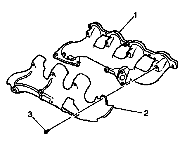 4. Install the heat shield (2) and bolts (1) to the exhaust manifold (1).