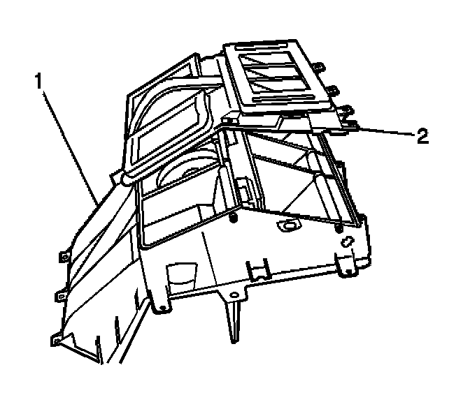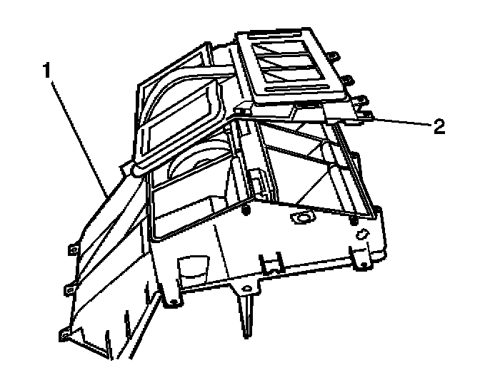 5. Remove screws in order to separate the defroster/mode outlet cover (2) from the HVAC module assembly (1).