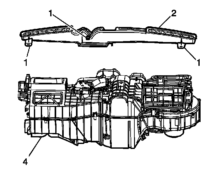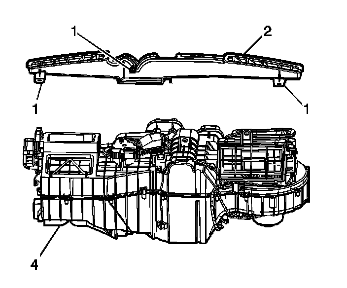 1. Install the defroster duct (2) to the HVAC module (4) and press down to secure.