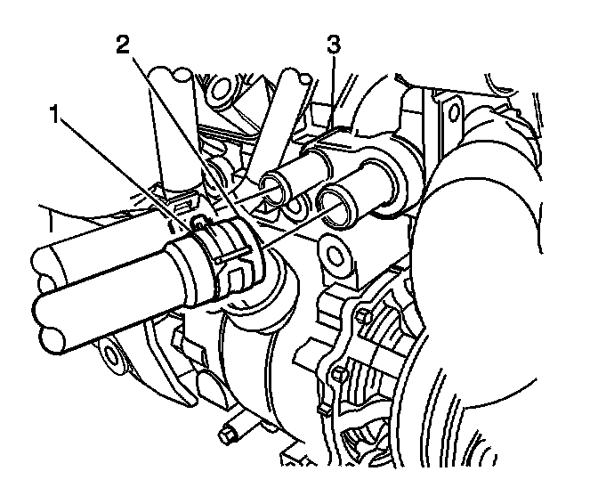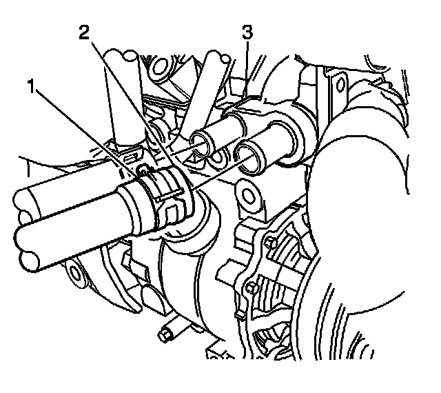 3. Position the heater inlet hose clamp (1) at the engine block (3) using the J 38185.