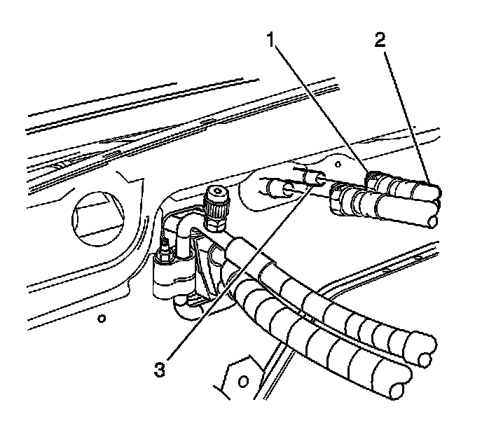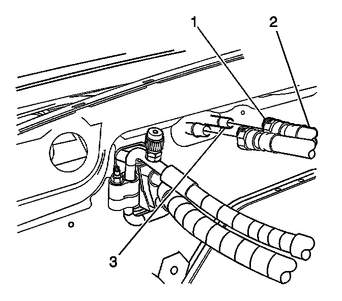 6. Squeeze the 2 tabs on the side of the heater inlet hose connector (1) at the heater core (3). Pull the heater hose (2) back to remove from the heater core (3).