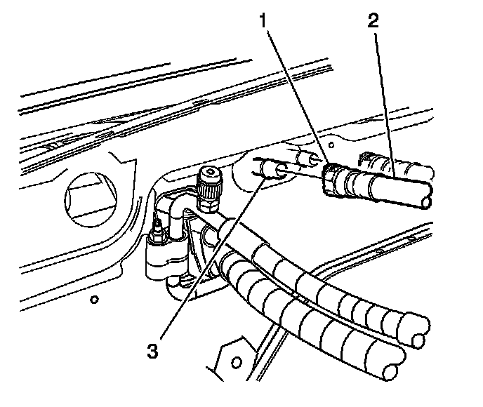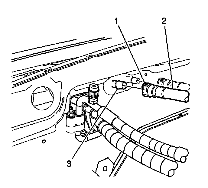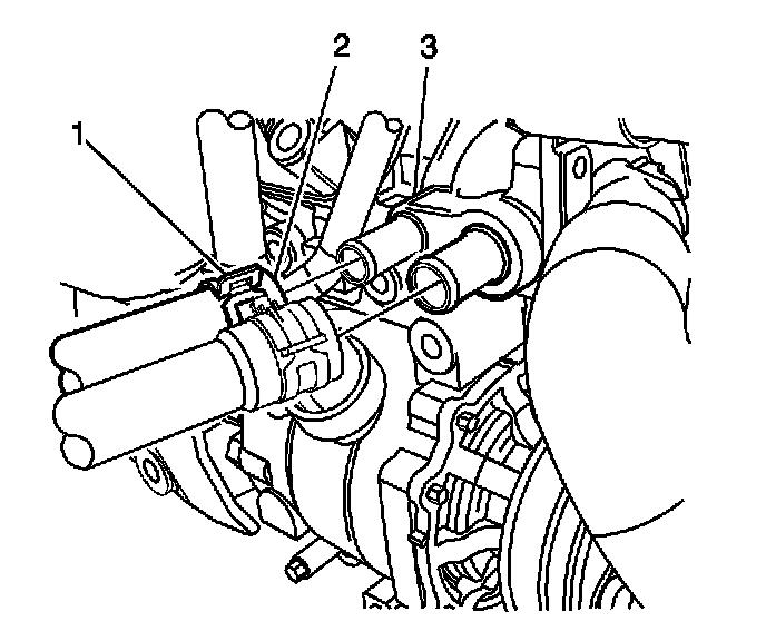 6. Squeeze the 2 tabs on the connector (1) at the heater core (3). Pull the heater hose (2) back to remove from the heater core (3).