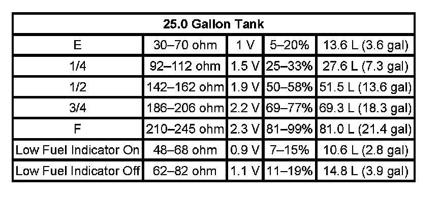 The information in this table is intended for use with the J 33431-C Signal Generator and Instrument Panel Tester. The fuel level sensor values represent the test values to be used on the Signal Generator to drive the fuel gage display to the indicated positions. Vehicles that require more than one fuel level sensor calculate gage position from many possible resistance combinations of fuel levels between the two tanks. Therefore, the values in the table may not correlate directly to readings taken from the vehicle primary or secondary sending units.