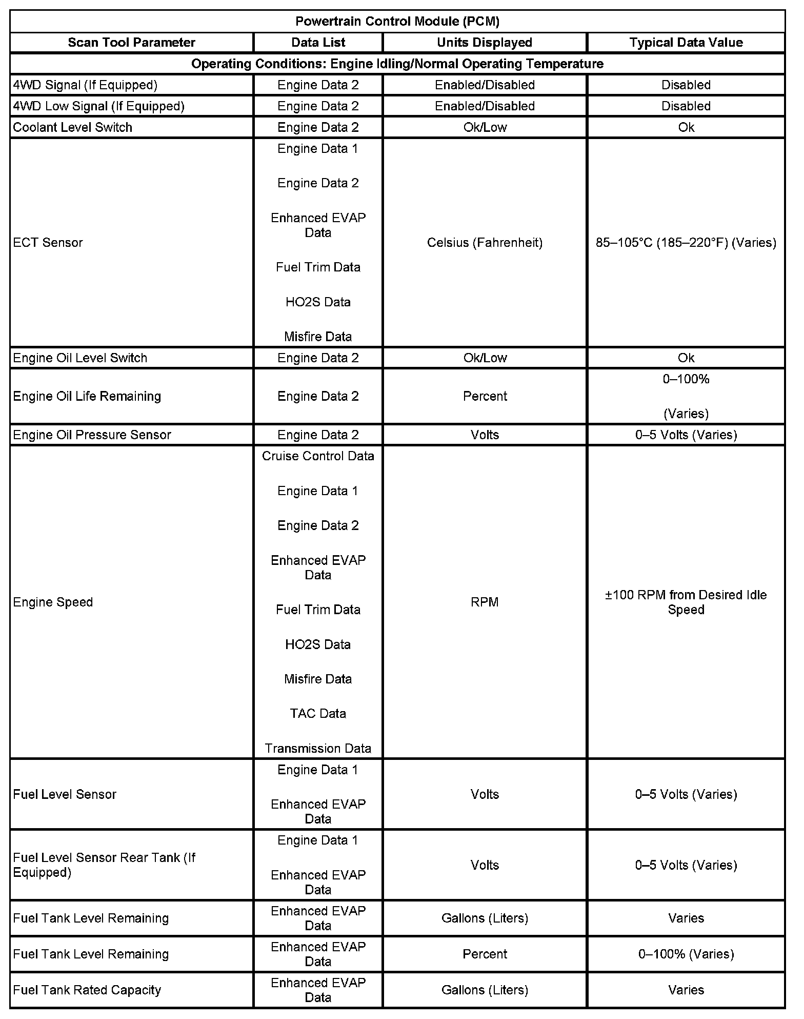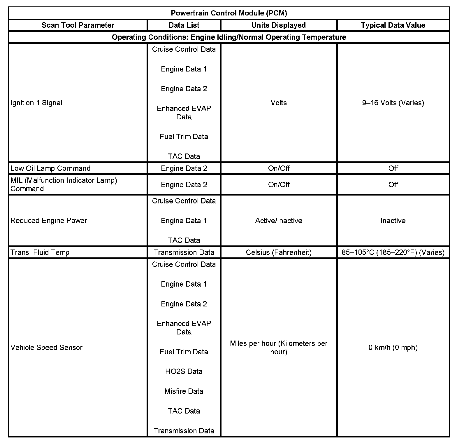 Scan Tool Data List - Powertrain Control Module (PCM)