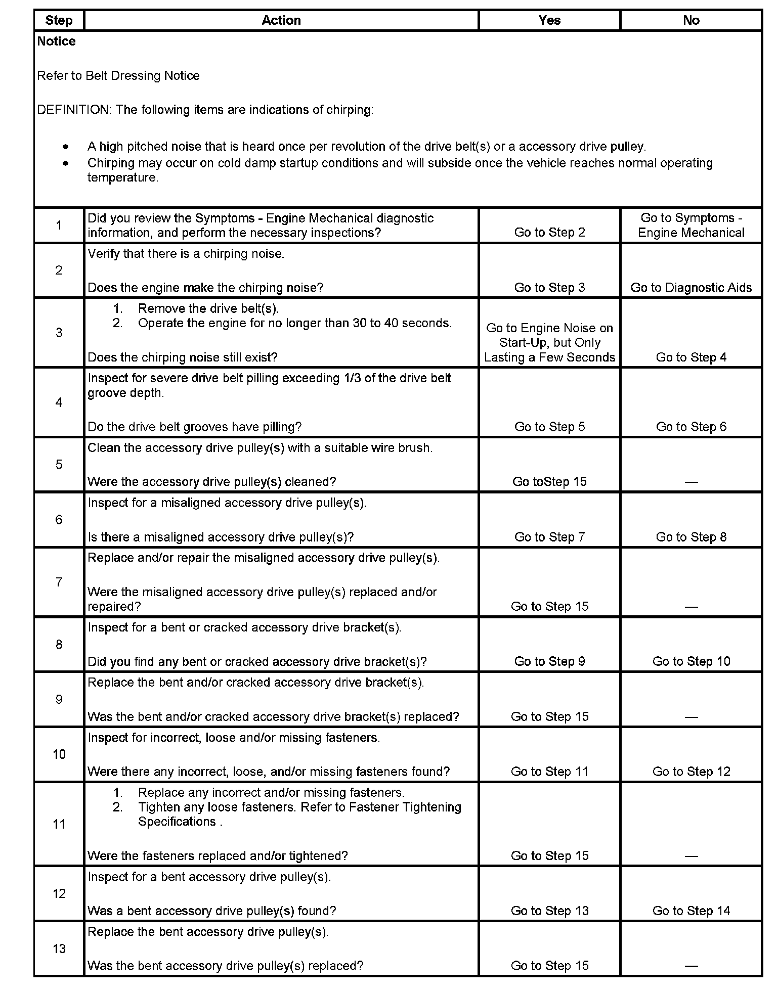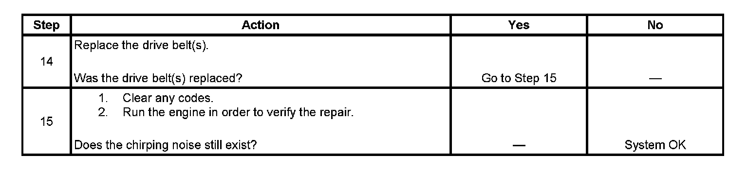 3. The noise may be an internal engine noise. Remove the drive belt(s) and operate the engine for a few seconds, this will verify if the chirping noise is related to the drive belt(s) or not. With the drive belt(s) removed the water pump will not operate and the engine may overheat. Also diagnostic trouble codes (DTC's) may set when the engine is operated with the drive belt(s) removed.